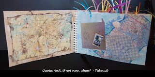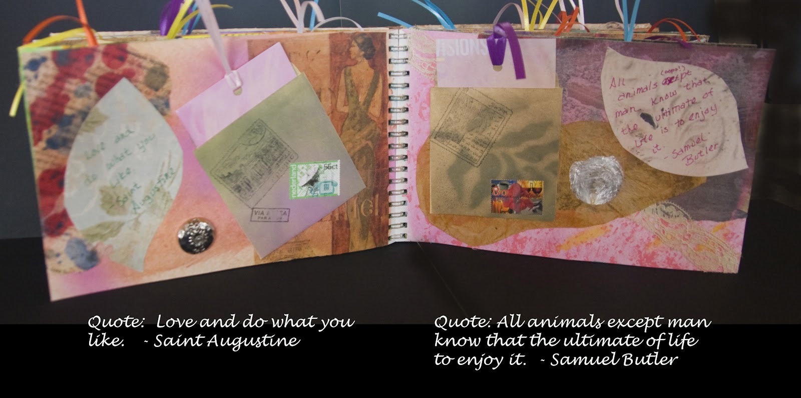 Here's part 1 of my prepped art travel journal pages. Each page has its own quote, which is reflected on the bottom of each page. My plan for the journal is to take it with us when we take our August trip. Each day I will add my own thought for the day written on the tab in each library card envelope, and also include a photo of the day! Since the quotes speak for themselves, I won't add any other comments. I think you can click on each image to enlarge it to read the quote! Enjoy!